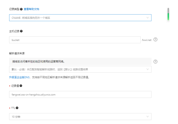 這里有個“自動添加CNAME記錄”的選項,其實很好理解,就是你的OSS存儲和域名是在同一個阿里云賬號的話,開啟后域名會自動添加一條解析記錄,如果不在同一個賬號下,就不要開啟了,添加后如下圖所示: