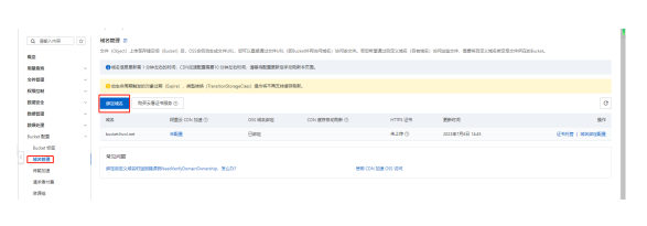 第三步,就是上傳提示的“綁定自定義域名”,點擊“bucket配置”->“域名管理”,如下圖所示:然后點擊“綁定域名”