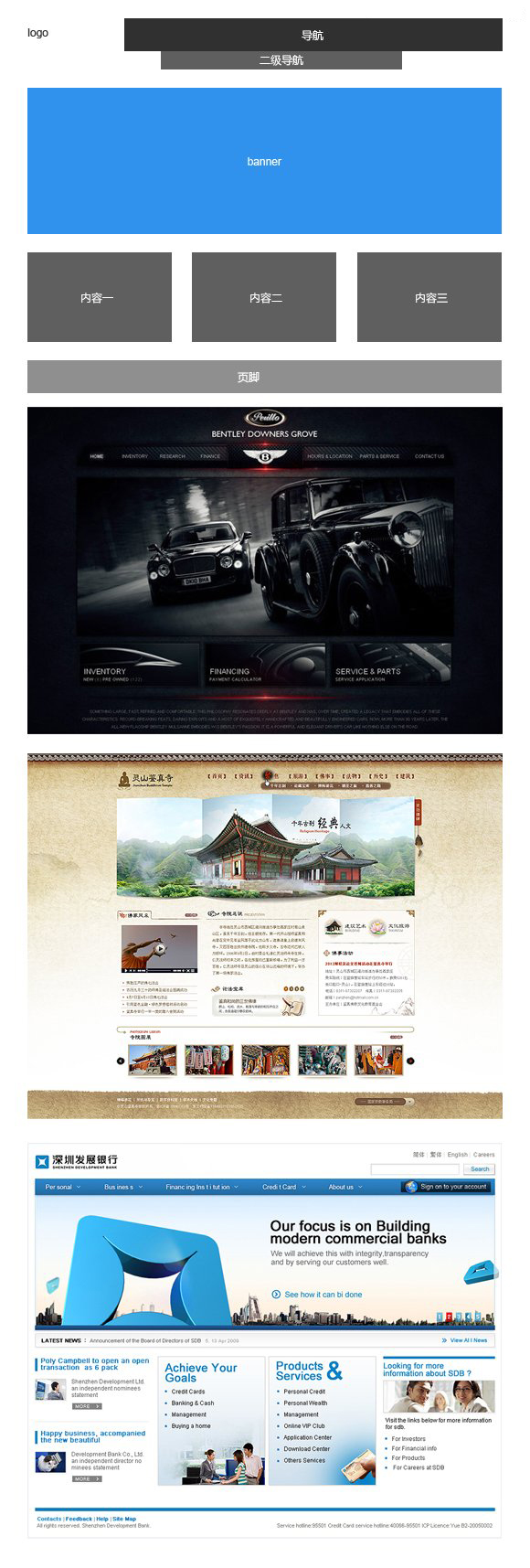 這種布局方式即是我在上面提到的常見的網(wǎng)站布局,不是說這種網(wǎng)站布局方式一無是處,但我們總不能只會這一種布局方式,次次套用吧?按照這種布局當然也可以做出來漂亮的設計,但畢竟方框限制的視線的擴展,如果客戶要求做出大氣的感覺,一般不會按照這種方式來布局,通常來講,大氣意味著開闊視野。