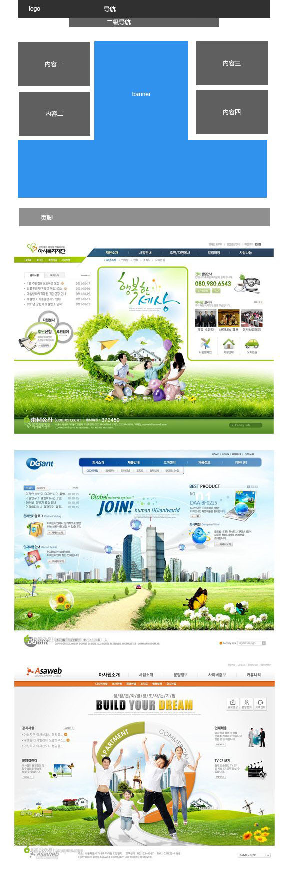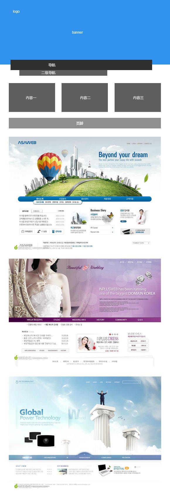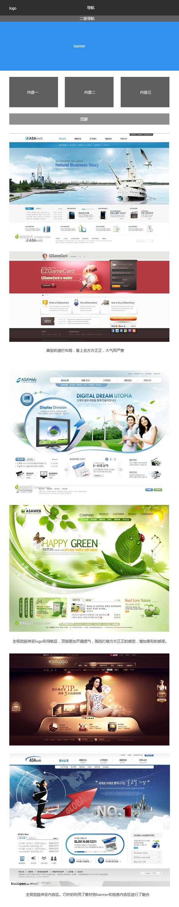 設計中總是擺脫不了大框套小框的設計布局思路,不加思索的跳入單一的網(wǎng)頁布局形式中,于是就有了把企業(yè)站常用的頁面布局方式總結一下的想法,讓大家包括我自己全面的了解一下企業(yè)站的常見布局方式,做到對此種類型的網(wǎng)站布局心中有數(shù),跳出狹隘、單一的設計思路。很多人常常詢問某個頁面該如何布局這樣的問題,其實網(wǎng)頁布局也沒有想象中那么難,只要做到兩點我認為起碼可以做到臨陣不慌,一是對常見的布局方式心中有數(shù),二是根據(jù)信息內容及設計素材的特點進行擺積木式的多次嘗試。活不多說,下面就是我總結的企業(yè)站首頁常用到的六種網(wǎng)站布局方法。