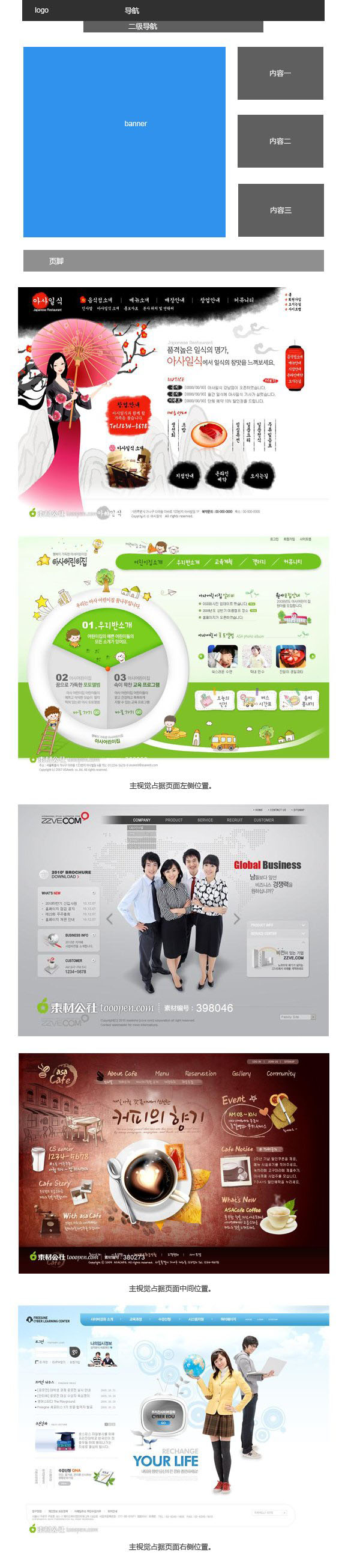 這種布局方式讓視線不再受到方框的限制,比起上面的布局方式,自然多了些大氣、開闊的味道來。另外,主視覺部分還可以靈活處理,既可以向上拓展到logo和導航的頂部位置,也可以向下拓展到內容區(qū)域,這種布局方式也是非常常見的布局方式。