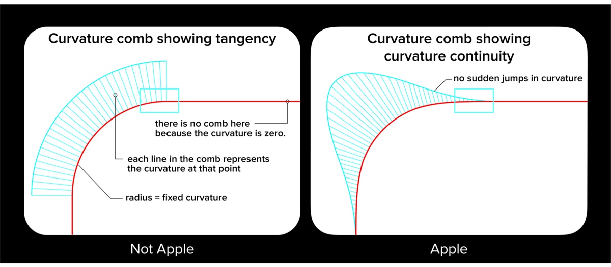 簡單來說,Apple 采用的圓角曲率所生成的圖形,是更圓滑,無明顯切角的。這樣的圓角矩形在過渡上更平滑,且在視覺上的體驗也更融洽。