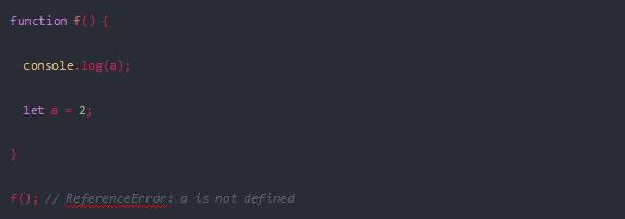 這段代碼直接報錯顯示未定義,let與const擁有類似的特性,阻止了變量提升,當代碼執行到console.log(a)時,執行換將中a還從未被定義,因此產生了錯誤.返回。