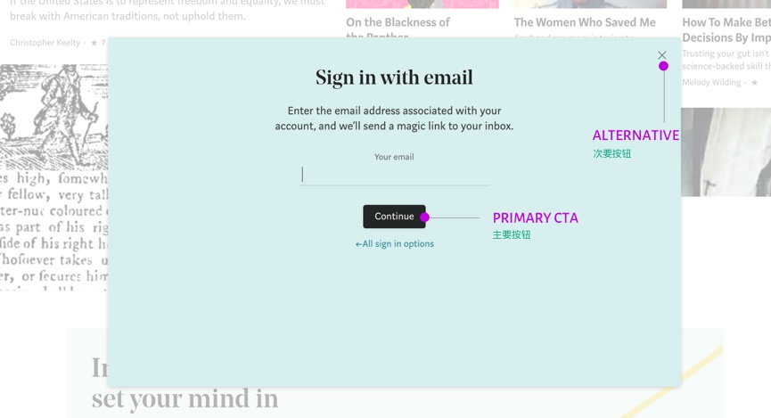 △ Medium的登錄模態彈窗使用X icon 來代表關閉按鈕