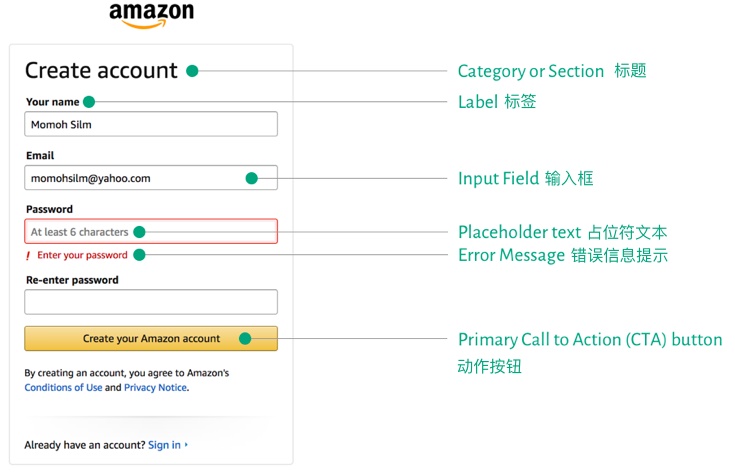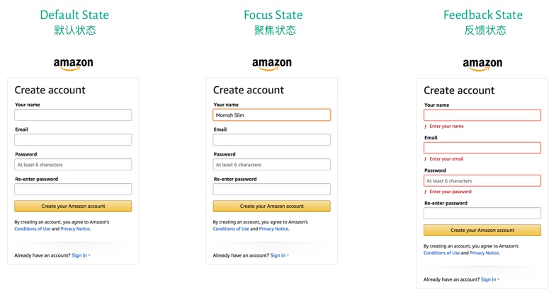 △ Amazon創建賬戶表單的「默認、聚焦、反饋」頁面狀態