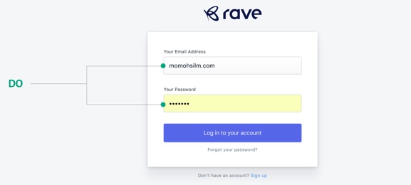 △ Flutterwave’s Rave的登錄頁面,輸入區域的尺寸與預期的輸入字段的長度比例一致