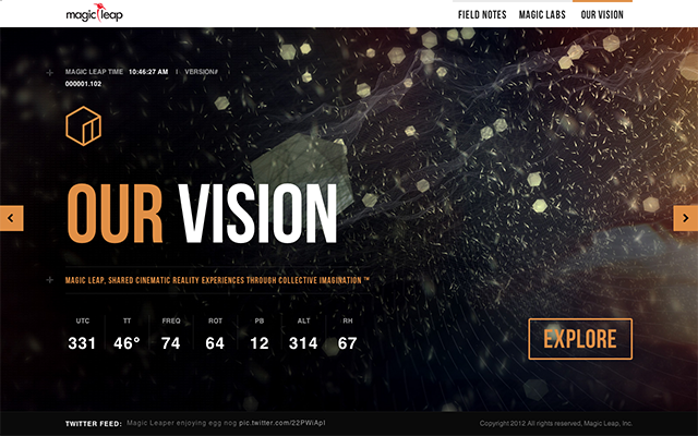 如圖一:Magic Leap的網頁背景利用光點和光束形成了一種看似漸變的特別效果,黑色與光束之間的搭配總是顯得大氣又神秘。少量的橙色元素與光束的顏色完美契合,讓瀏覽者既能一眼找到重點,背景又不單調。